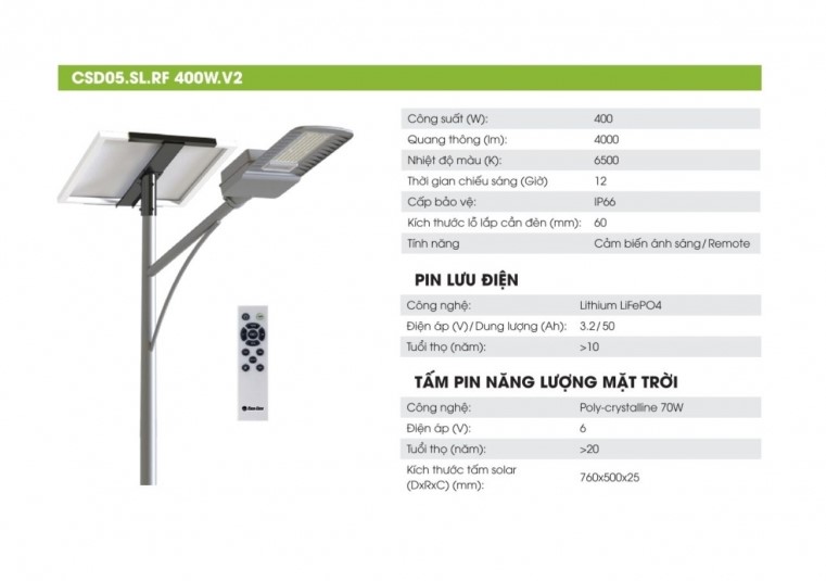 Đèn LED Chiếu sáng đường Năng lượng mặt trời Rạng Đông – CSD05.SL.RF 400W.V2