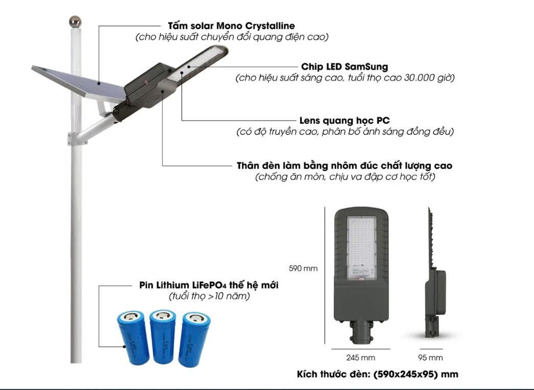 - Pin LiFePO4 50Ah, bền trên 20.000 giờ; tấm pin Mono 70W tuổi thọ 20 năm.